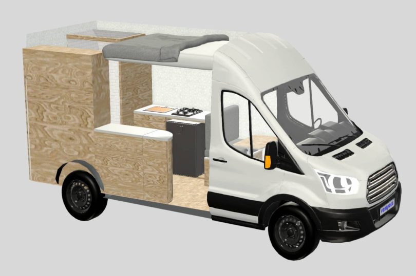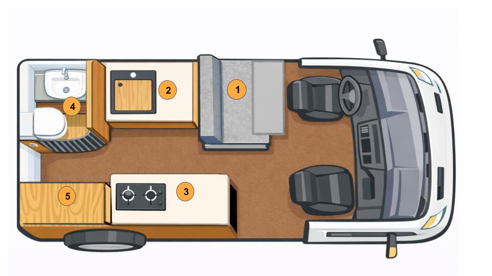 Pohjaratkaisun suuret linjat ratkaisi se, että lattiapinta-alaa on käytettävissä vain noin viisi neliötä. Siihen täytyy saada mahtumaan paitsi pääosa kalusteista ja lisäpenkit, myös paljon tekniikkaa, mm. lämmitin, raikasvesisäiliö ja akut. Korkeussuunnassa tilaa kuitenkin on, joten sitä täytyy pystyä hyödyntämään mahdollisimman paljon.