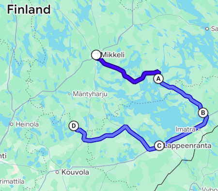 - Reitti: lähtö Pirkanmaalta – Mikkeli – Puumala – Ruokolahti – Lappeenranta – Repoveden kansallispuisto – takaisin Pirkanmaalle