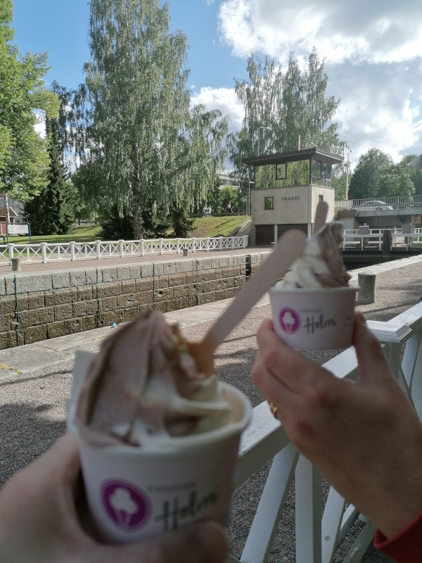 Ajoimme ensin Pirkanmaalta Päijänteen länsipuolta etelään, eli Kuhmoisten ja Padasjoen kautta Asikkalan Vääksyyn. Vääksy on kaunis pieni taajama ja sen suurin vetonaula on Vääksyn kanava, joka yhdistää Päijänteen ja Vesijärven. Kanavaa reunustaa puistoalue, jossa on mukava kuljeskella ja syödä jäätelöä lämpimänä kesäpäivänä, ja samalla seurata kanavan toimintaa. Kanavan lähettyvillä on Päijännetalo, jossa on matkailuinfo, vaihtuvia näyttelyitä ja kahvila. Sieltä voi myös varata paikan viereiseen matkaparkkiin. Emme itse yöpyneet Vääksyssä, joten emme voi kertoa kokemuksia matkaparkista, mutta alue kokonaisuudessaan on kuitenkin viihtyisä ja tekemistä ja näkemistä riittää. Lisätietoa löytyy Vääksyn kanavanseudun matkailusivuilta.